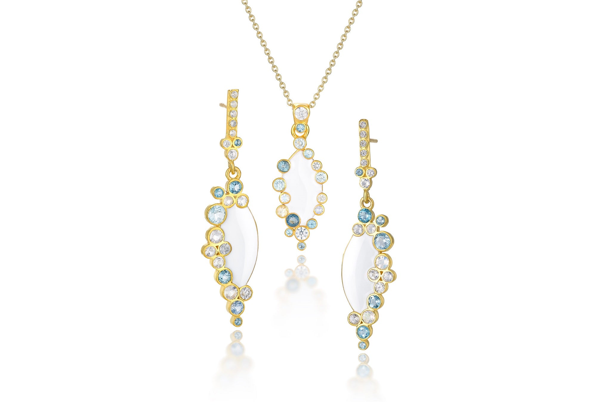 The white enamel pendant is surrounded by white zircons or diamonds (0.7ct), aquamarines, blue topaz and blue moonstones.