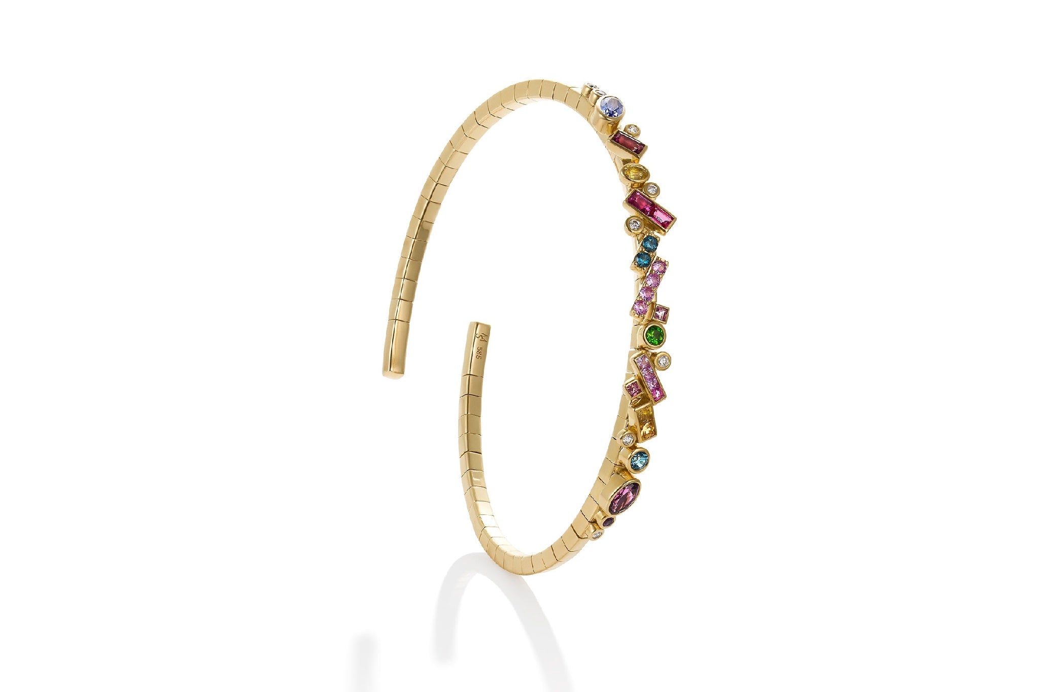 Starburst has a flexible bracelet in 14ky with 0.03ct diamonds + 0.66ct multi-colored gemstones. Size: 2.5mm wide. Playful and elegant.